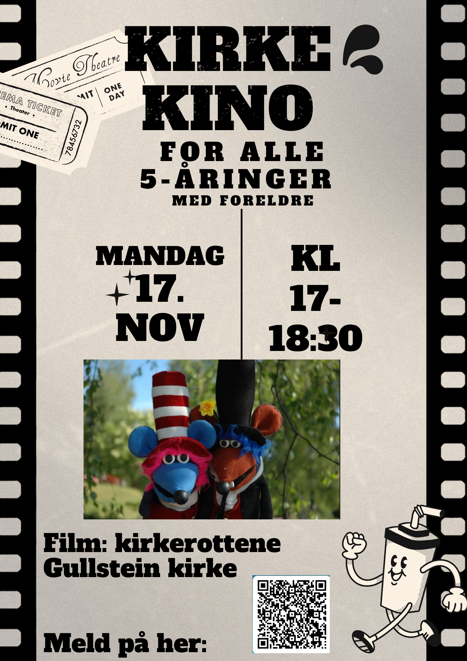 Alle 5-åringer! Velkommen til kirkekino i Gullstein kirke. Mandag 17. november kl 17-18:30.